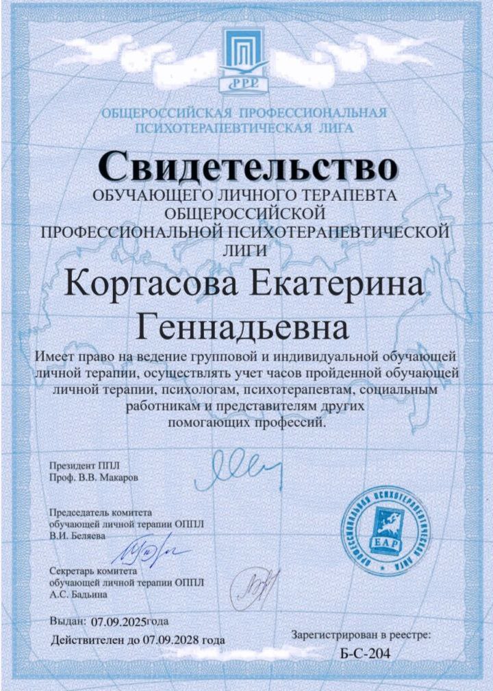 Аккредитованный Обучающий личный терапевт и Супервизор Профессиональной Психотерапевтической Лиги